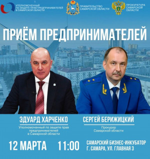 Уполномоченный по защите прав предпринимателей в Самарской области Эдуард Харченко совместно с прокурором Самарской области Сергеем Бережицким проведут прием предпринимателей, посвященный обсуждению актуальных вопросов ведения бизнеса в городском округе Самара.