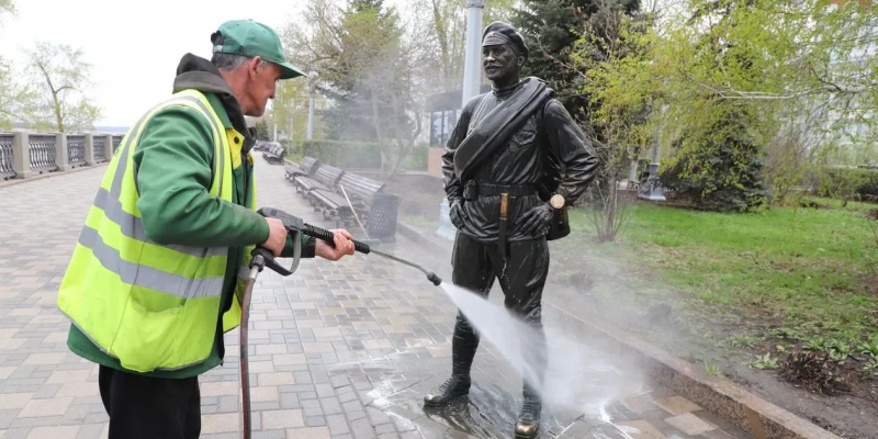 Все городские памятники, выполненные в бронзе, во избежание повреждений отмывают без использования химических средств — например, жанровую скульптуру «Товарищ Сухов», которая расположена на I очереди набережной, Буратино в Литературном сквере на ул. Фрунзе, шестиметровую скульптуру Дяди Степы на пешеходной части ул. Ленинградской и др. При работе с гранитом городские службы максимально аккуратно применяют аппараты подачи воды под высоким давлением. Для сложных загрязнений используются специализированные чистящие средства, подобранные с учетом материала объекта. Далее в течение теплого сезона памятники будут мыть регулярно, например, на набережной — не менее двух раз в месяц.