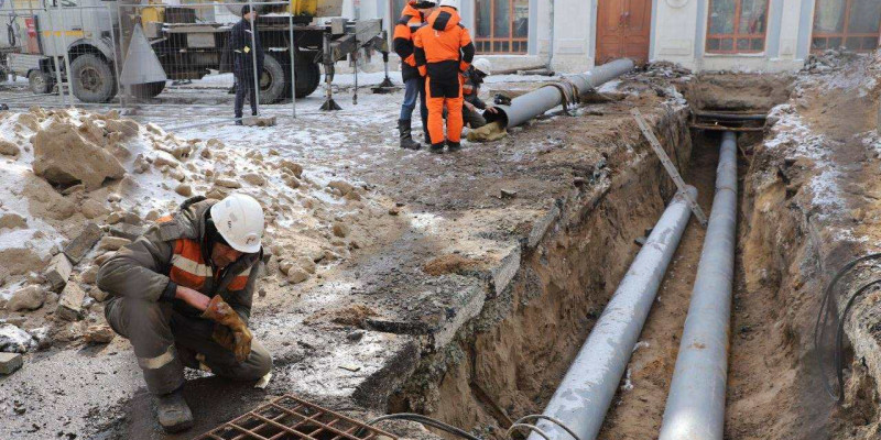 На аварийном участке были демонтированы рельсошпальная решетка трамвайных путей, произведены земляные работы, удален фрагмент старого трубопровода диаметром 100 мм, на которым обнаружен дефект.