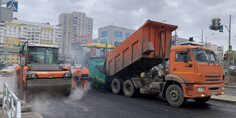 Для оперативности работ на объекте задействуют сразу два асфальтоукладочных комплекса. Это позволяет получить практически бесшовное покрытие, на котором незаметны продольные и поперечные стыки. Применяется высокотехнологичная и износостойкая асфальтобетонная смесь ЩМА-16 на полимерно-битумном вяжущем, которая ранее хорошо зарекомендовала себя на других объектах улично-дорожной сети.