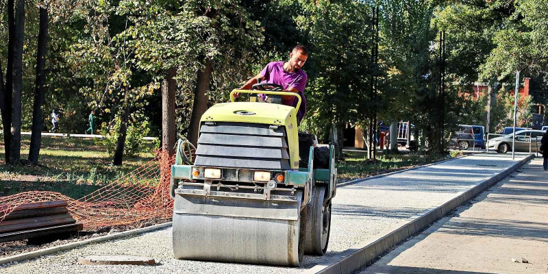Уложенный щебень рабочие утрамбовывают. Далее нанесут битумную эмульсию, поскольку следующим этапом будет укладка нового покрытия.