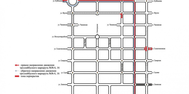 Движение троллейбусных маршрутов № 6, 16 будет организованно следующим образом (в обоих направлениях): по своему маршруту – ул. Куйбышева – ул. Льва Толстого – далее по своему маршруту, сообщает Департамент транспорта города Самары.