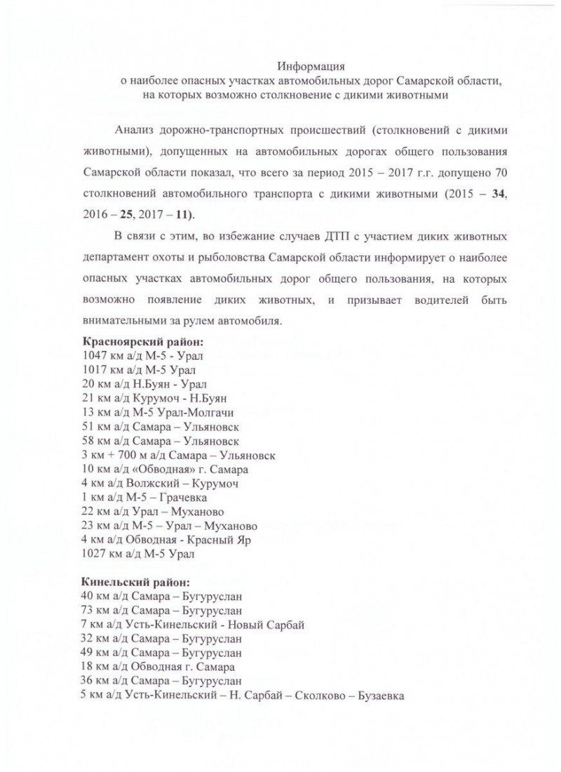 На автодорогах Самарской области с 2015 по 2017 г.г. допущено 70 столкновений автотранспорта с дикими животными. В связи с этим департамент охоты и рыболовства региона информирует о наиболее опасных участках дорог, где возможно появление диких животных, и призывает водителей быть внимательными за рулем.