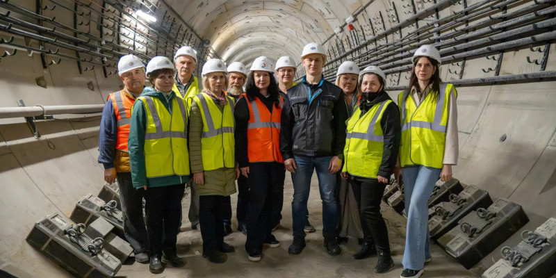 Директор ВТС-Метро Алексей Федосеев представил основные зоны станции, включая технические помещения, и подробно рассказал об особенностях реализации проекта. Участники посетили ключевые производственные площадки: от входных групп до глубинных тоннельных участков. Преподаватели прошли по строительной площадке и спустились через первый пешеходный выход (готовность монолитных конструкций - 92%), осмотрели будущий вестибюль №1, где уже завершена отделка технических помещений, а также камеру тоннельной вентиляции, осмотрели платформу будущей станции, тягово-понизительную подстанцию и камеру водоотливной установки. Особый интерес вызвал участок тоннеля, где ведутся работы по устройству сбоек в правый перегонный тоннель – самой глубокой точке объекта.