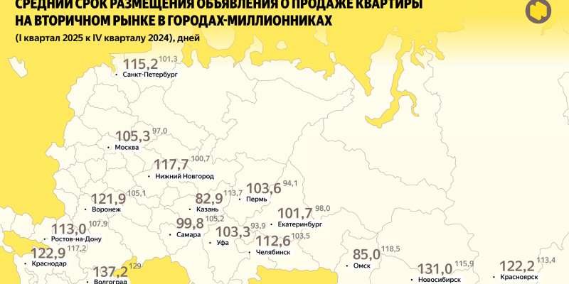 В первом квартале 2025 года дольше всего объявления о продаже готовой квартиры оставались активными в Волгограде (+6% к IV кварталу 2024 года до 137 дней), Новосибирске (+13% до 131 дня), Краснодаре (+5% до 123 дней), Красноярске (+8% до 122 дней) и Воронеже (+16% до 122 дней). В среднем менее ста дней объявления были активны в Казани (83 дня) и Омске (85 дней).