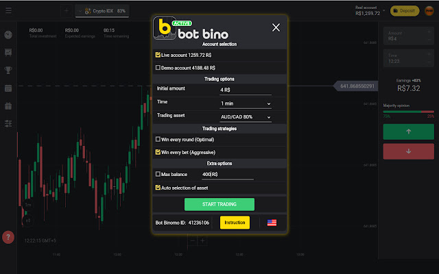Как правило, боты БО позволяют задать: набор активов брокера, их стоимость, время экспирации (исполнения сделки), максимально допустимый убыток. Для настройки индикаторов необходимо ввести: тип актива, тип инструмента, режим работы. После выбора режима следует указать временной период и процент доходности.