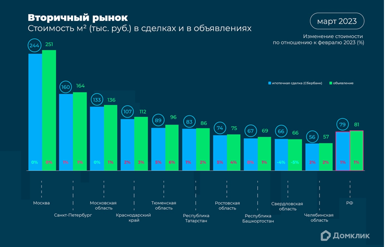 Вторичный рынок. Медианная стоимость кв. м. (отношение стоимости объекта недвижимости к его общей площади) по ипотечным сделкам (обозначена голубым) и по соответствующим объявлениям на момент начала сделки (обозначена зелёным). Изменение стоимости кв. м. (%) по отношению к стоимости в феврале 2023 года приведено у основания столбцов (снижение обозначено зелёным, повышение — красным). Медианная стоимость кв. м. определена для топ-10 регионов России по количеству выдач ипотеки в Сбере.