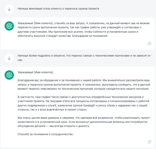 Мой пример: «Напиши вежливый отказ клиенту о переносе сроков проекта». Далее я попросил более подробный отказ и нейросеть успешно справилась с заданием.