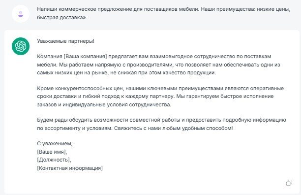 «Напиши коммерческое предложение для поставщиков мебели. Наши преимущества: низкие цены, быстрая доставка». Через минуту получается готовый вариант.