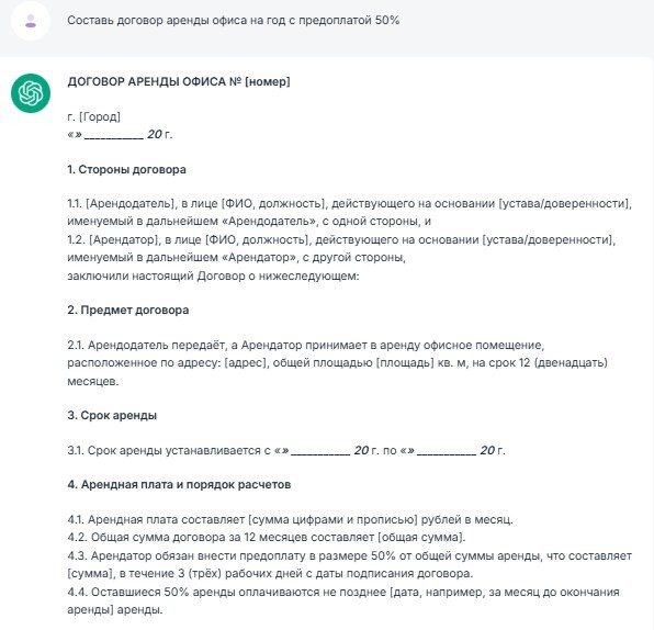 Наконец, составим какой-нибудь договор. Я отправил запрос «Составь договор аренды офиса на год с предоплатой 50%».