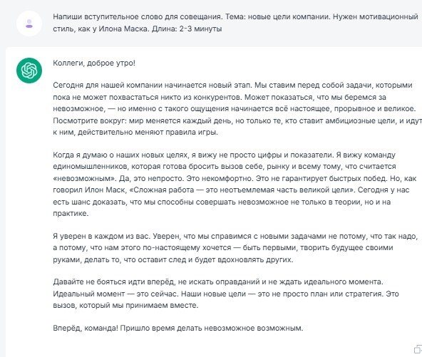 Я написал вот такой пример: «Напиши вступительное слово для совещания. Тема: новые цели компании. Нужен мотивационный стиль, как у Илона Маска. Длина: 2-3 минуты».