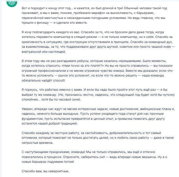 «Напиши благодарственную речь для сотрудников в конце года. Акцент: был тяжелый год, но мы справились. Добавь легкий юмор. Длина: 3 минуты».
