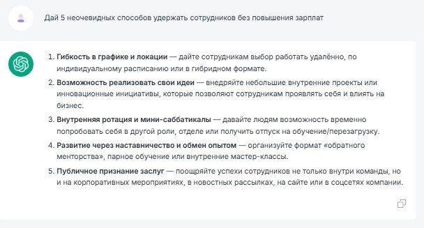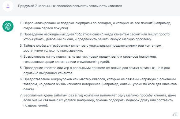 Когда нужен креатив, но мозг отказывается генерировать крутые идеи, то именно нейросети становятся вашим лучшим помощником. Всего один запрос — и вы получаете 10, 20 или даже 100 вариантов решения задачи. ИИ прекрасно придумает новые продукты/услуги, варианты мотивации команды, а также подбросит решения кризисных ситуаций.