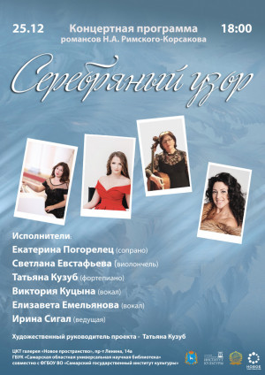 Музыкальная встреча – посвящение русскому композитору, 180-летие со дня рождения которого в этом году отмечает вся Россия. В программе вечера, подготовленной музыковедом, кандидатом культурологии Татьяной Кузуб, – романсы великого Н.А. Римского-Корсакова на нетленные стихи классиков русской, немецкой и английской поэзии. Знакомые песни и мелодии исполнят лауреаты всероссийских и международных конкурсов Екатерина Погорелец (сопрано); Светлана Евстафьева (виолончель) и Татьяна Кузуб (фортепиано), а также восходящие звёзды самарской сцены: студентки СГИК, стипендиаты фонда Муслима Магомаева Виктория Куцына и Елизавета Емельянова. Ведущая программы – кандидат педагогических наук, заведующая кафедрой вокального искусства СГИК Ирина Сигал.
