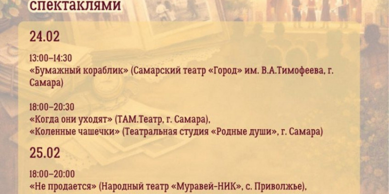 18:00–20:30 «Когда они уходят», ТАМ.Театр (г. Самара), «Коленные чашечки», Театральная студия «Родные души» (г. Самара).