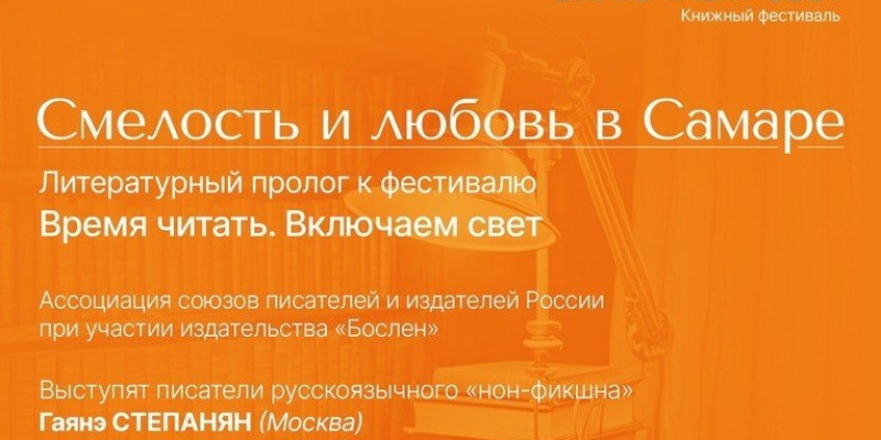 Позднее, в 17:00, пролог к фестивалю «Время читать» перейдёт в область литературы: в галерее «Новое пространство» начнётся творческий вечер «Смелость и любовь в Самаре». С презентацией своих новейших работ выступят участники «Литературной резиденции»* Гаянэ Степанян (Москва), Дарья Ильгова (Москва), Ирина Шейбак (Санкт-Петербург), Илья Сергодеев (Снежинск), Ильдар Абузяров (Балашиха), Олег Яненагорский (Ханты-Мансийск). Все эти писатели являются авторами сочинений в жанре «нон-фикшн», также известном как «нехудожественная литература».