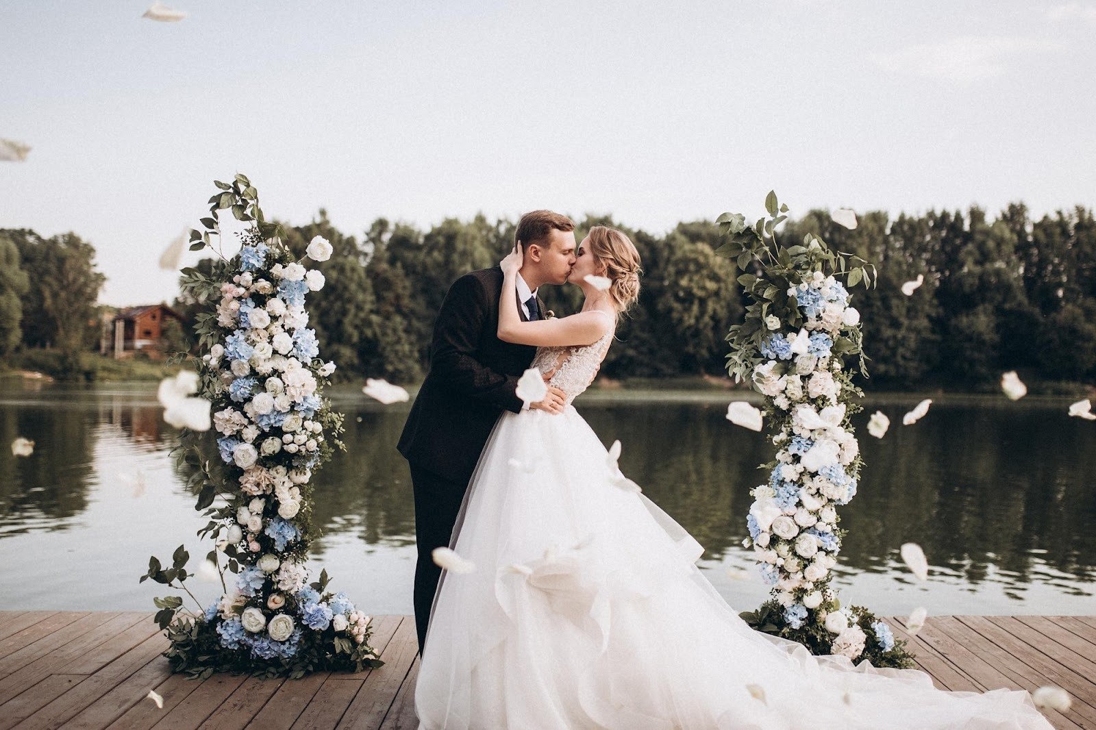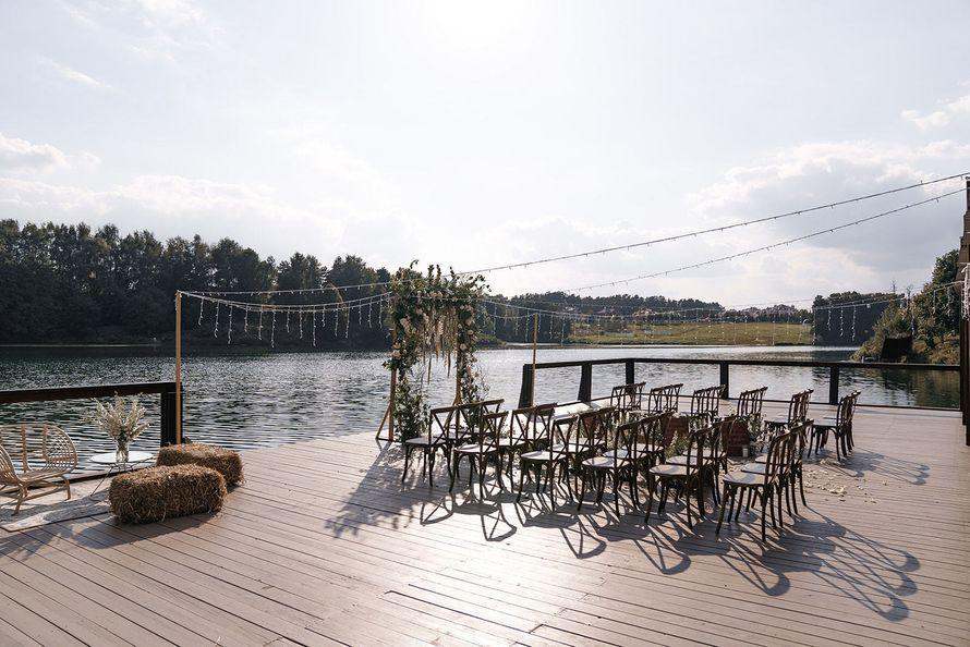 - Живописное окружение — с одной стороны, открывается вид на воду, с другой — раскидистые деревья и зелёные лужайки. Природный пейзаж добавляет романтики и служит отличным фоном для свадебных фото.