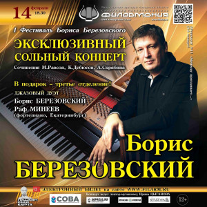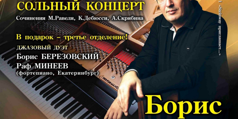 А 15 февраля в Самарской филармонии состоится симфонический вечер. Академический симфонический оркестр Самарской государственной филармонии под управлением художественного руководителя и главного дирижера оркестра Дениса Власенко. Солист – заслуженный артист РФ Борис Березовский (фортепиано). В программе: «Послание Церере» П. Дятлова, Концерт №3 для фортепиано с оркестром С. Прокофьева, Сюита из мюзикла «Вестсайдская история» Л. Бернстайна, Концерт для фортепиано с оркестром Фа мажор Дж. Гершвина. Для тех, кто любит блюз, в подарок - 3-е отделение в Хрустальном фойе филармонии. Борис Березовский и группа «Blues Doctors» (Екатеринбург).13 февраля, в четверг, в 16:00 в Большом зале СМУ им. Д. Шаталова пройдёт творческая встреча и мастер-класс с заслуженным артистом РФ Борисом Березовским для студентов и преподавателей музыкальных ВУЗов города.