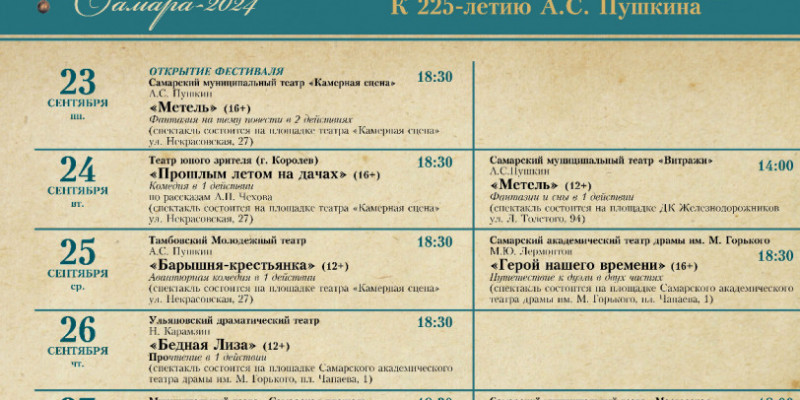 С 23 по 29 сентября на сцене муниципального театра «Камерная сцена» состоится V Всероссийский фестиваль «Русская классика. Страницы прозы». Мероприятие организовано театром совместно с Департаментом культуры и молодежной политики Администрации городского округа Самара при участии Самарского отделения Союза театральных деятелей РФ. В этом году он посвящен 225–летию со дня рождения Александра Сергеевича Пушкина.