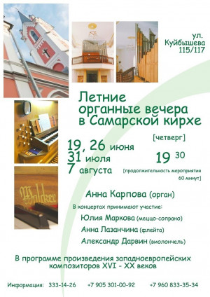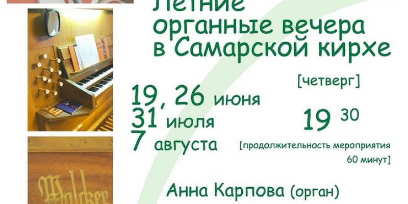 Евангелическо-лютеранская церковь Св. Георга г. Самары (Самарская кирха) приглашает на Летние органные вечера в свой зал! Предлагаем вместе совершить музыкальное путешествие по разным странам и эпохам. Программы всех вечеров разные, но во всех концертах обязательно будет звучать музыка И.С. Баха и Г.Ф. Генделя, 340-летие со дня рождения которых мы празднуем в этом году.