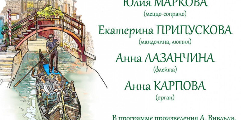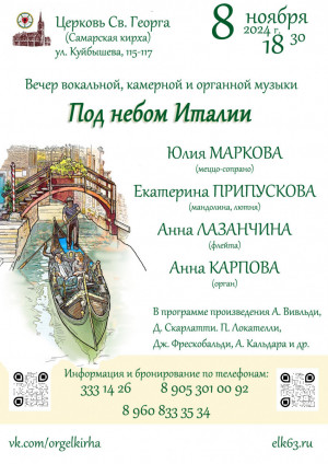 8 ноября в зале Евангелическо-лютеранской Церкви Святого Георга (ул. Куйбышева 115/117) состоится Вечер вокальной, камерной и органной музыки «Под небом Италии» в этот день зрители, вместе с Юлией Марковой (меццо-сопрано), Екатериной Припусковой (лютня, мандолина), Анной Лазанчиной (флейта) и Анной Карповой (орган) будут наслаждаться яркой и красочной музыкой итальянских композиторов. Зрителей ждут необычные сочетания тембров и настоящее итальянское тепло и праздничность.