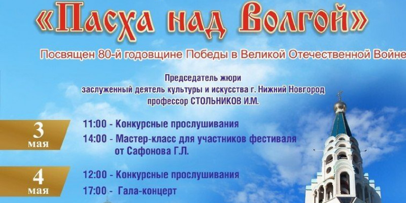 3 и 4 мая в Самаре пройдет VIII Межрегиональный фестиваль-конкурс хоровой музыки «Пасха над Волгой», посвященный 80-й годовщине Победы в Великой Отечественной войне. Он пройдет в концертном зале собора Софии Премудрости Божией (ул. Соколова, 1А) и будет организован Самарской епархией.