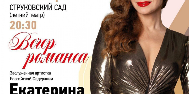 7 сентября с 20.30 до 22.00 в летнем театре Струковского сада пройдёт вечер романсов с участием Екатерины Гусевой в сопровождении пианиста и композитора, заслуженного артиста России Александра Покидченко. Выступление заслуженной артистки РФ завершит первый день Всероссийского фестиваля духовых оркестров «На сопках Маньчжурии». В рамках концерта Екатерина Гусева исполнит такие произведения, как «Побудь со мной», «Белой акации гроздья душистые», «Мне нравится, что вы больны не мной», «Загадка женщины», «Музыкант играл на скрипке», «Старый рояль», «Опавшие листья» и другие.