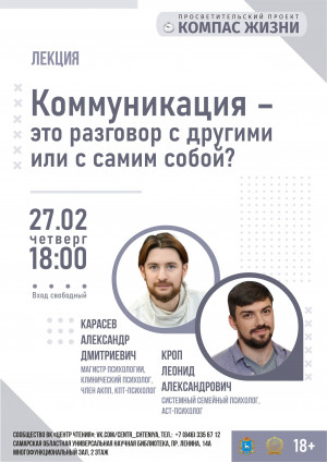 27 февраля в 18:00 Самарская областная универсальная научная библиотека приглашает жителей города посетить новую встречу проекта «Компас жизни» при участии специалистов психотерапевтической клиники «Про тебя». Самарские психологи порассуждают о том, чем является межличностная коммуникация: разговором с другими людьми или на самом деле с самим собой?