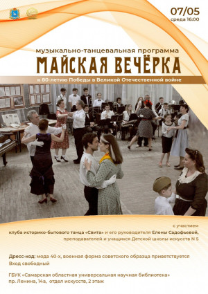 7 мая в 16:00 в Самарской областной универсальной научной библиотеке состоится музыкально-танцевальная программа «Майская вечёрка». Гости библиотеки смогут почувствовать себя в роли участников клубного вечера времён Великой Отечественной войны.