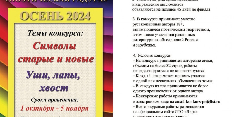 К участию в конкурсе приглашаются русскоязычные авторы 18+, занимающиеся поэтическим творчеством, в том числе участники различных литературных объединений России и зарубежья.