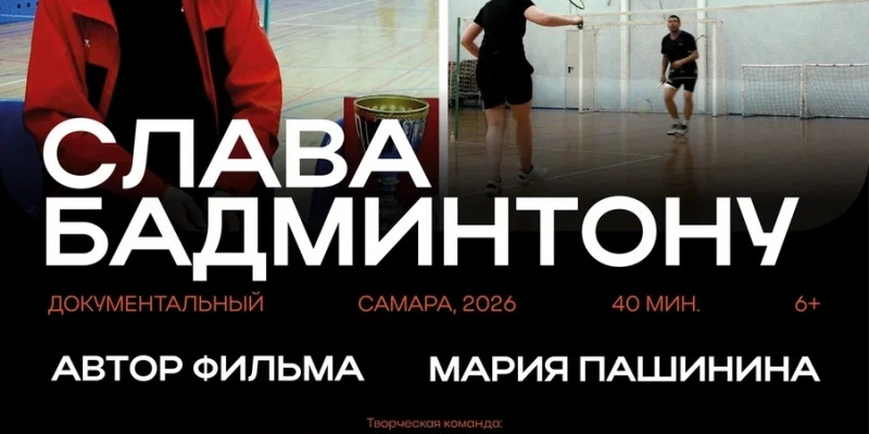 1 апреля в 18.00 в кинотеатре «Художественный» состоится премьера документального фильма, снятого в Самарской области, «СЛАВА БАДМИНТОНУ» (40 мин, 6+).