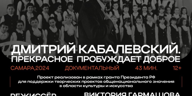 В Самарской области состоится премьера документального фильма «Дмитрий Кабалевский. Прекрасное побуждает доброе» (12+), снятого к 120-летию советского композитора, дирижёра, пианиста, педагога, общественного деятеля Дмитрия Борисовича Кабалевского. Автор картины самарский режиссер Виктория Гармашова.