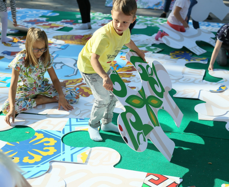 Желающим предлагалось поучаствовать в сборке мозаичного панно "паззл дружбы", которое представляет собой герб Самарской области размером 6х6 метров из 81-ой детали в обрамлении национальных орнаментов народов региона.