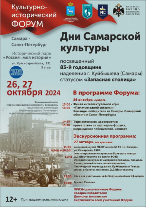Фонд социального развития «Надежда» при поддержке Департамента культуры и молодежной политики Администрации г.о. Самара 26-27 октября проводит культурно-исторический форум «Дни самарской культуры», посвященный 83-й годовщине наделения г. Куйбышева (Самары) статусом «Запасная столица». Партнером проекта выступает Российское военно-историческое общество.
