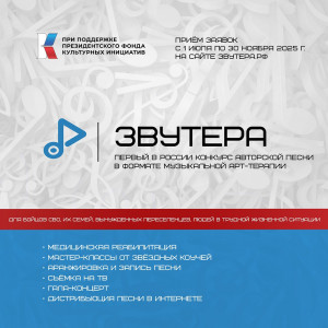 В июле 2025 года стартовал уникальный конкурс для авторов и исполнителей песен «Звутера» – участниками конкурса могут стать участники СВО, члены их семей, вынужденные переселенцы, а также граждане, которые попали в трудную жизненную ситуацию. Финалисты запишут свои песни на профессиональной студии, примут участие в съемках на ТВ, и выступят на большом гала-концерте. Лучшие работы будут выложены на все известные музыкальные сервисы.