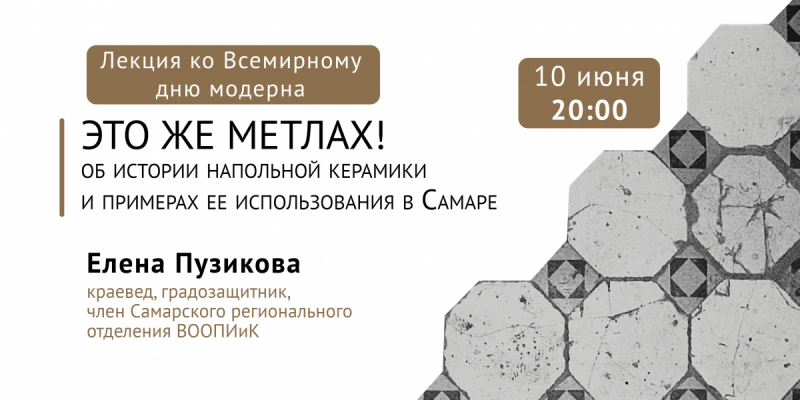 На лекции Елена Пузикова расскажет об истории возникновения, успеха, гибели и возрождения производства напольной метлахской плитки и примерах ее использования в Самаре, а также об очистке дореволюционной керамики на Фабрике-кухне, которой занимались волонтеры под руководством членов регионального отделения ВООПИиК.