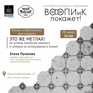 10 июня в 20.00 во дворе Музея модерна пройдет лекция «Это же метлах!» (12+), приуроченная ко Всемирному дню модерна. Ее прочитает краевед, градозащитник, член Самарского регионального отделения ВООПИиК Елена Пузикова. Вход свободный.