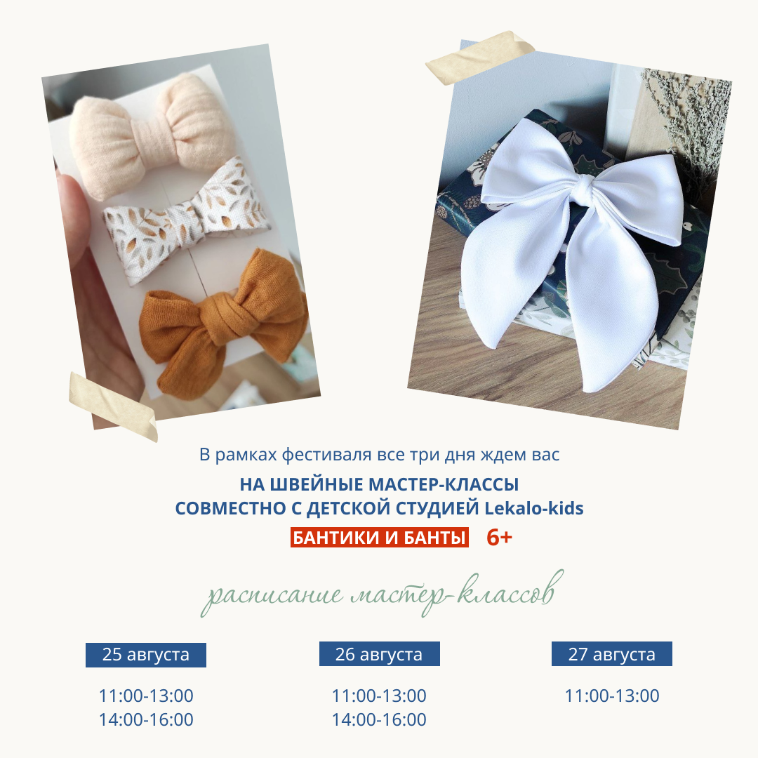 В рамках фестиваля ждем вас на швейные мастер-классы совместно с детской студией Lekalo-kids по бантам и бантикам (возраст 6+)
