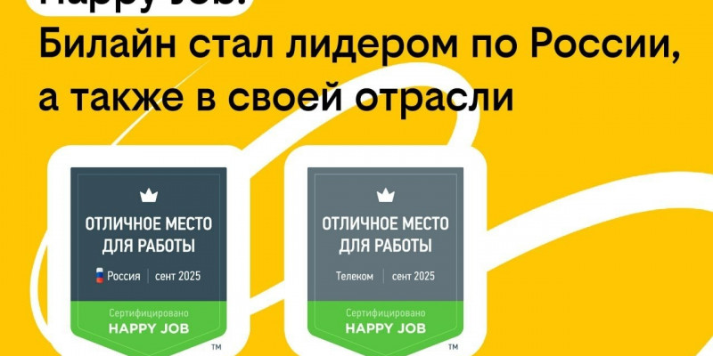 Билайн получил сертификат «Отличное место работы» от исследовательской компании Happy Job и вошел в число компаний с лучшим результатом по стране. Сертификат присваивается на основе результатов анонимного исследования вовлечённости сотрудников на платформе Happy Job, в ходе которого измеряются лояльность, eNPS, mNPS, удовлетворенность сотрудников уровнем заработной планы, льготами, рабочим местом, безопасностью и другое.