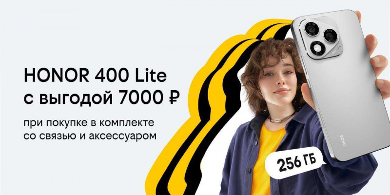 При покупке HONOR 400 Lite 256 ГБ в составе выгодного комплекта в интернет-магазине Билайна клиент получает выгоду 7000 рублей (6000 бонусных рублей на связь и защитное стекло стоимостью 1000 рублей). А совершая покупку в офисах обслуживания Билайна, вместо защитного стекла можно выбрать различные товары — умные часы или колонки, подписки на книги билайн и облако билайн, настройки, услуги и другое.