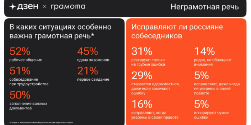 Ко Дню словаря контентная платформа Дзен и портал «Грамота.ру» опросили россиян* и узнали, в какой ситуации для них важнее всего грамотная речь и какие слова чаще всего используют в неверном контексте.
