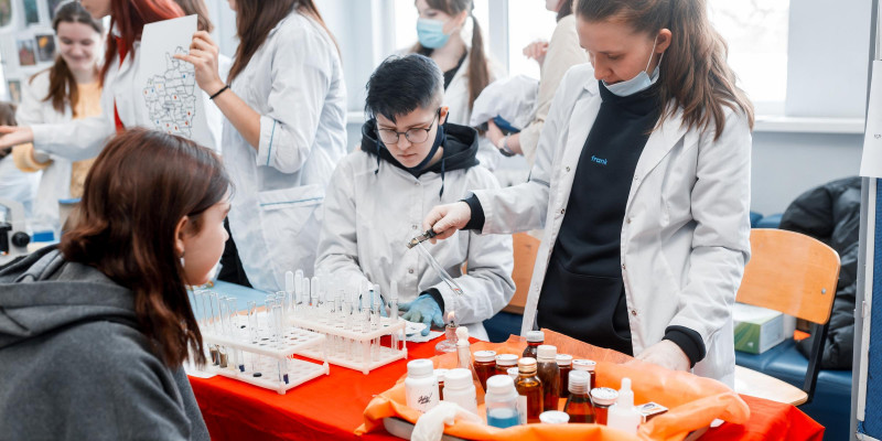 - Интерактивная площадка "Биохимия и биотехнология" – реакции на белки, углеводы, а также демонстрация методик получения костных трансплантатов.