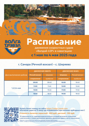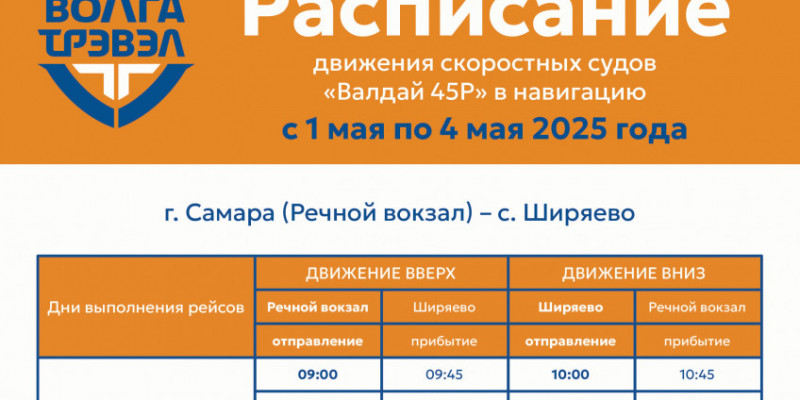 Расписание движения скоростных судов «Валдай – 45Р» в навигацию 2025 года в период с 1 по 4 мая