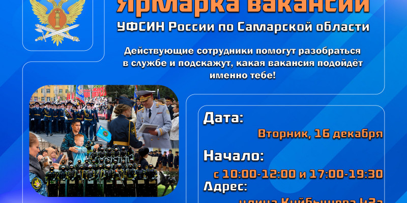 16 декабря в УФСИН России по Самарской области пройдёт ярмарка вакансий. Действующие сотрудники расскажут о специфике службы, ответят на вопросы и помогут подобрать подходящую вакансию. (18+)