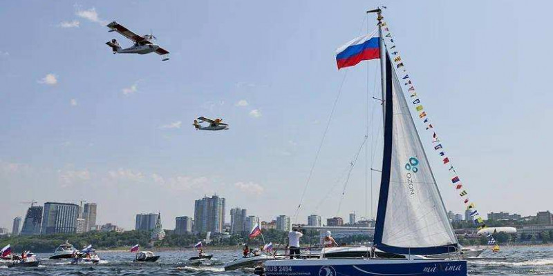 Массовая колонна маломерных судов, украшенная флагами России, прошла вдоль набережной Самары, до острова Голодный. В их числе - пассажирский теплоход «Спутник-Гермес» длиной более 98 метров и 3-х палубный теплоход «Валерий Чкалов», 2 военных корабля ДОСААФ России, парусные и моторные яхты, катера, гидроциклы и пароходы, а также техника спецслужб, в том числе, например, пожарный катер «Геннадий Яровой» с включенными брандспойтами. На протяжении всего парада колонну сопровождали 2 гидросамолета самарского производства во главе с пилотом Натальей Дмитриевой.