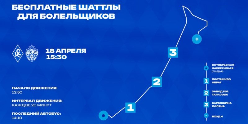 Для удобства болельщиков в день матча с ЦСКА до стадиона «Солидарность Самара Арена» от Ладьи можно доехать на бесплатных автобусах. Они помогут быстрее добраться на игру.