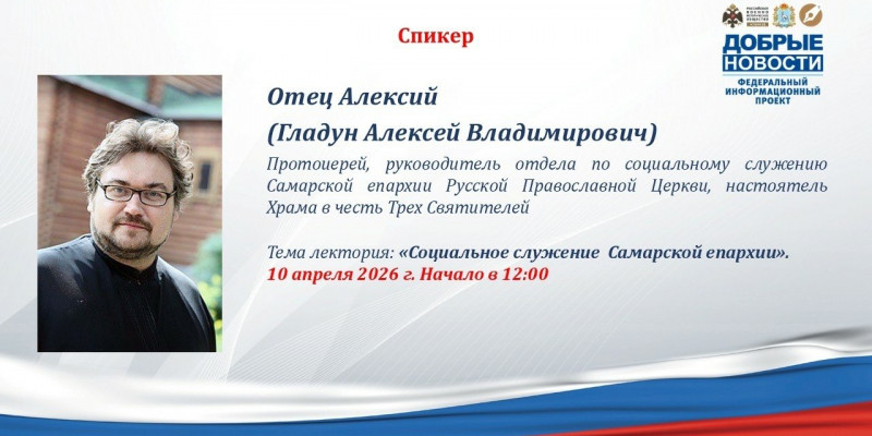 Спикером выступит Отец Алексий (Гладун Алексей Владимирович) - протоиерей, руководитель отдела по социальному служению Самарской епархии Русской Православной Церкви, настоятель Храма в честь Трех Святителей.