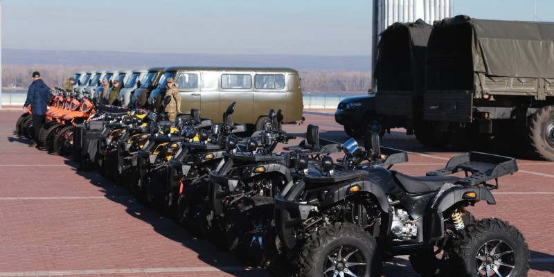 Автомобили УАЗ - 8 шт., мотоциклы – 14 шт., квадроциклы - 6 шт., квадрокоптеры, тепловизоры, станции РЭБ и многое другое. В общей сложности отправляется груз на сумму 160 млн рублей.