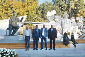 В торжественном открытии Литературного сквера и памятника Алексею Толстому приняли участие также потомки писателя — его внук Денис Толстой, правнук Никита Толстой и праправнук Михаил Толстой.