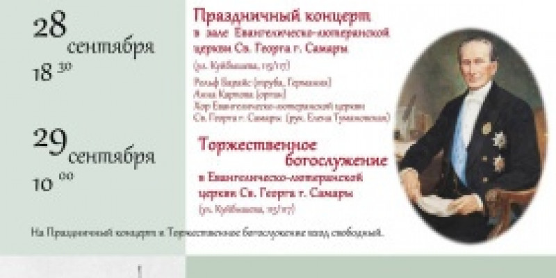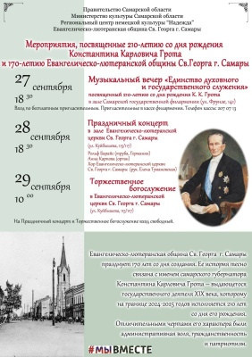 27 сентября 2024 года в 18:30 в Самарской государственной филармонии (ул. Фрунзе, 141) состоится межнациональный музыкальный вечер «Единство духовного и государственного служения», посвященный предстоящему 210-летию со дня рождения К.К. Грота и 170-летию со дня создания Евангелистическо-лютеранской общины Св. Георга г. Самара, которая является соорганизатором мероприятия, как и Региональный центр немецкой культуры «Надежда». (12+)